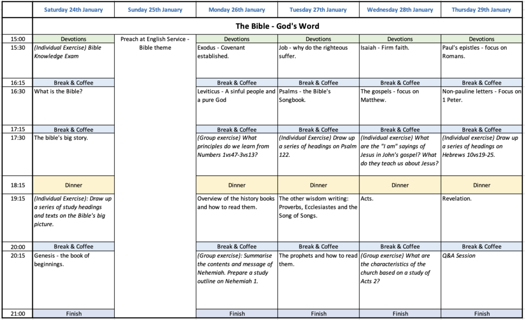 In this week will dive deeply into all of God’s word from Genesis to Revelation. As we worship the Lord reading and. studying His word we will aim to get a complete overview of God’s word that will enable you to better understand the flow and big picture of God’s word. These sessions are good for the newbie and expert in God’s word alike, there will be something for everyone.